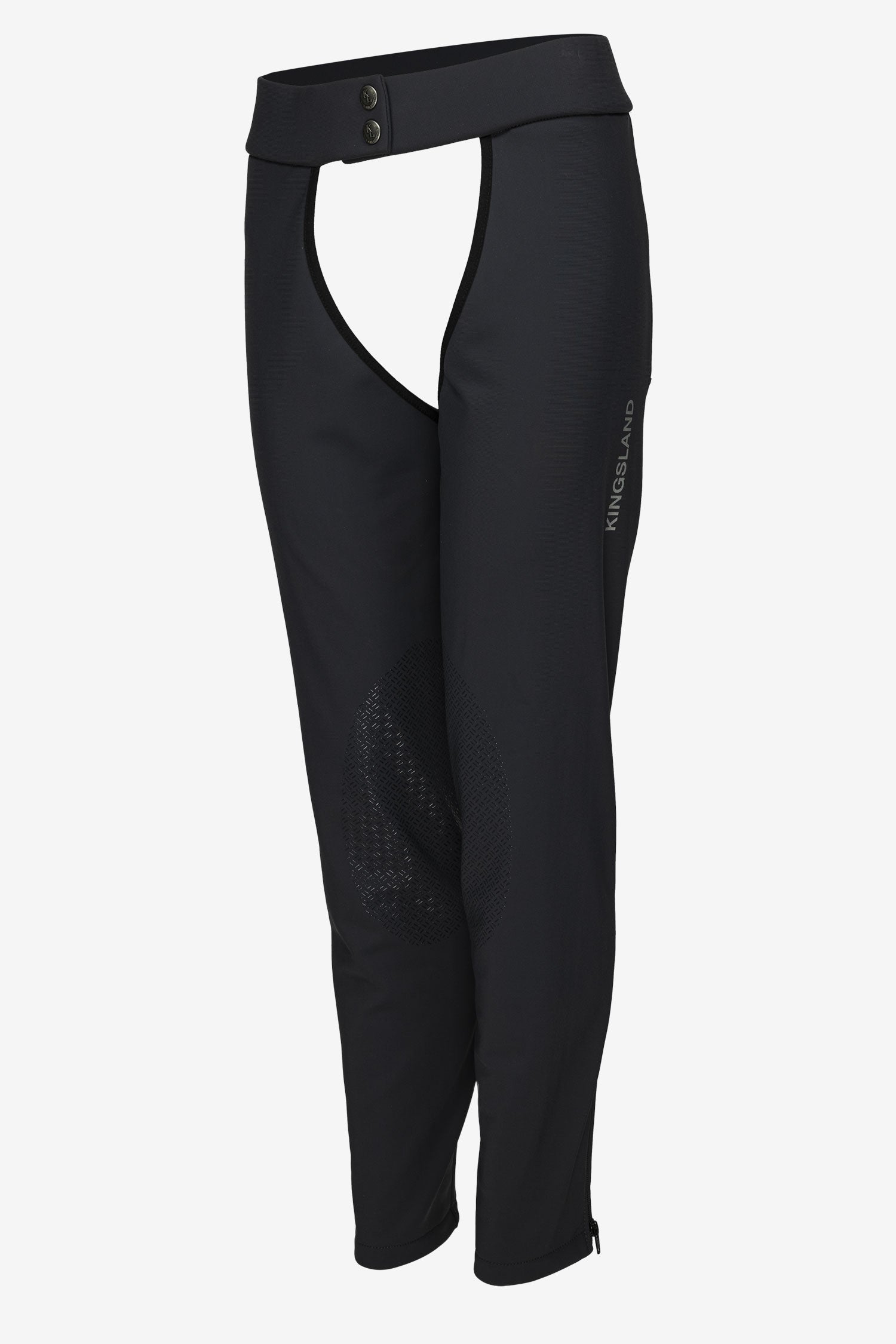 Chaps i blød og fleksibel softshell, der holder kold vind og regn væk fra dine ben under ridning og udendørsaktiviteter. Nem at tage på og af med lynlås på siden samt knapper foran til at lukke den brede linning med.