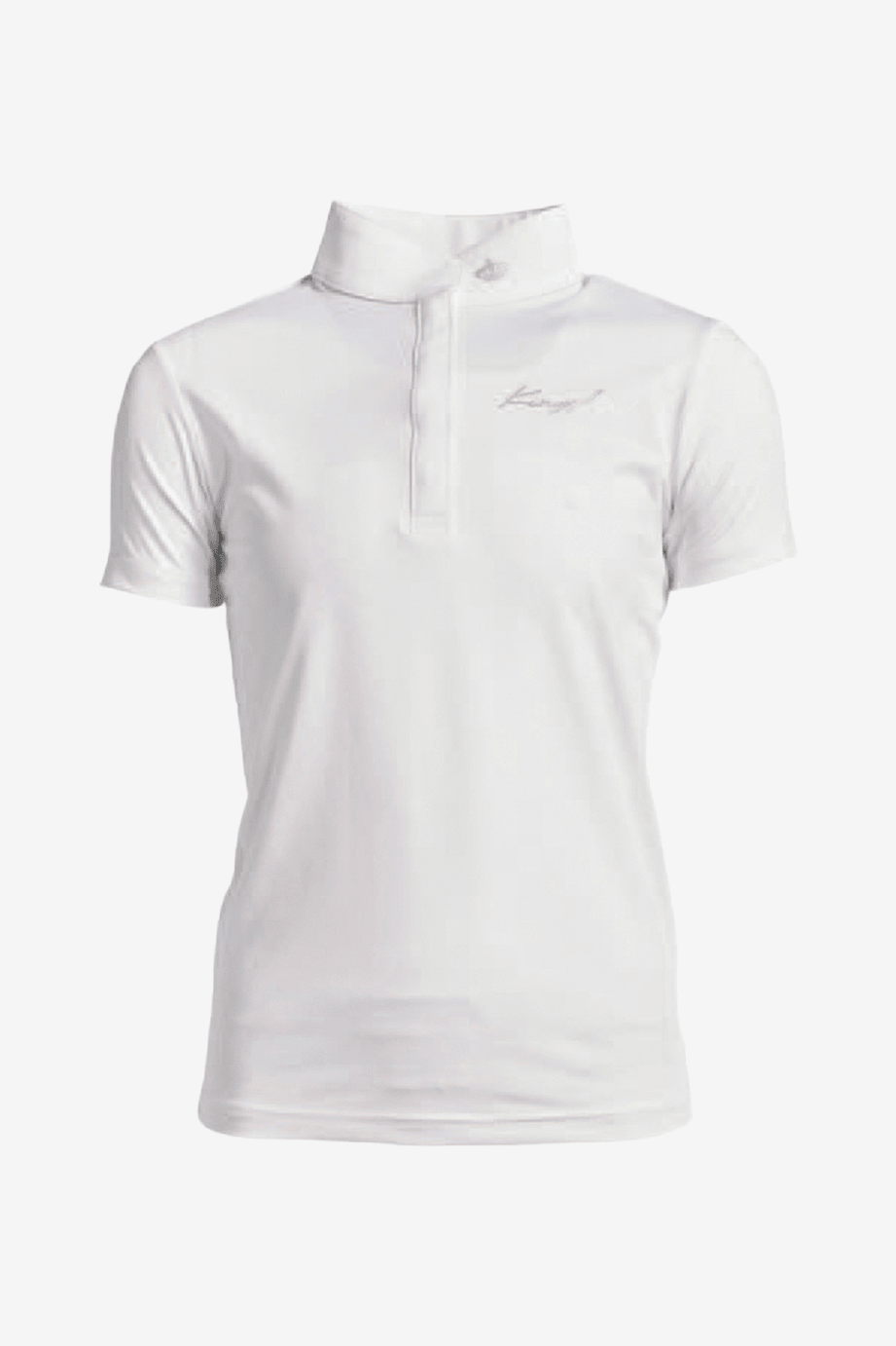 Snygg, kortärmad tävlingsskjorta från Kingsland. Klprincess har en minimalistisk design som gör dig snygg på tävlingsdagen. Tröjan är gjord i ett härligt tyg som glänser i solen, den har också en vävd krage med knapp. Snabbtorkande med bra andasfunktion. På bröstet sitter Kingslands fina logo i glitter.