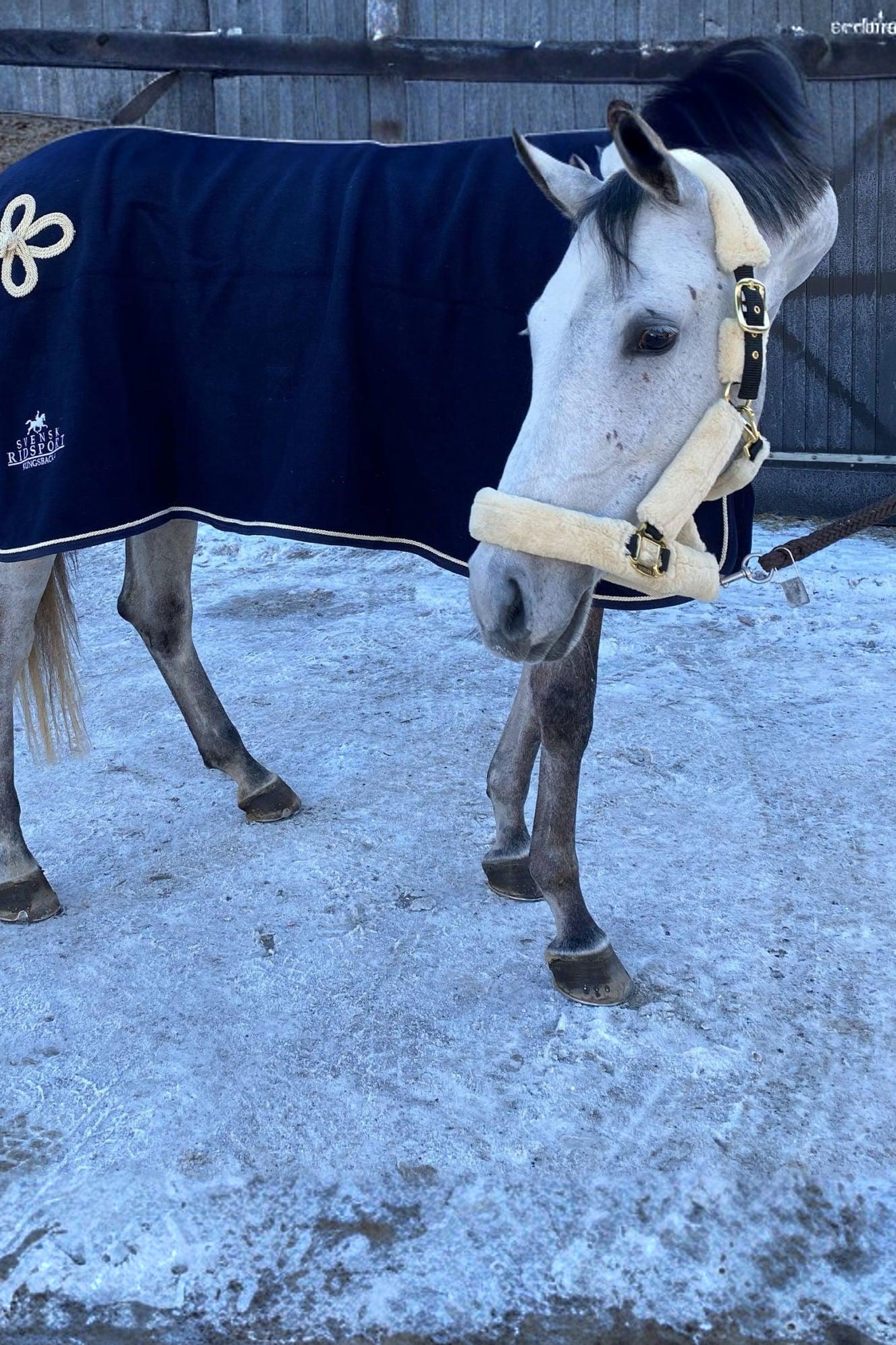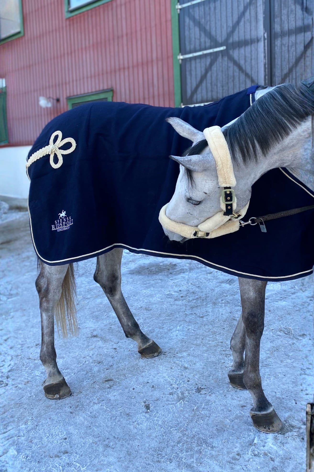 Uldtæppe fra LW. Flot uldtæppe smukt dekoreret med paspolering og halefletning. En maggjord, der nemt kan justeres i længden for den bedste pasform. Enkelt bogspænde, der hurtigt og nemt løsnes. Svensk Ridesport logo på den ene side fint broderet i kontrastfarve.