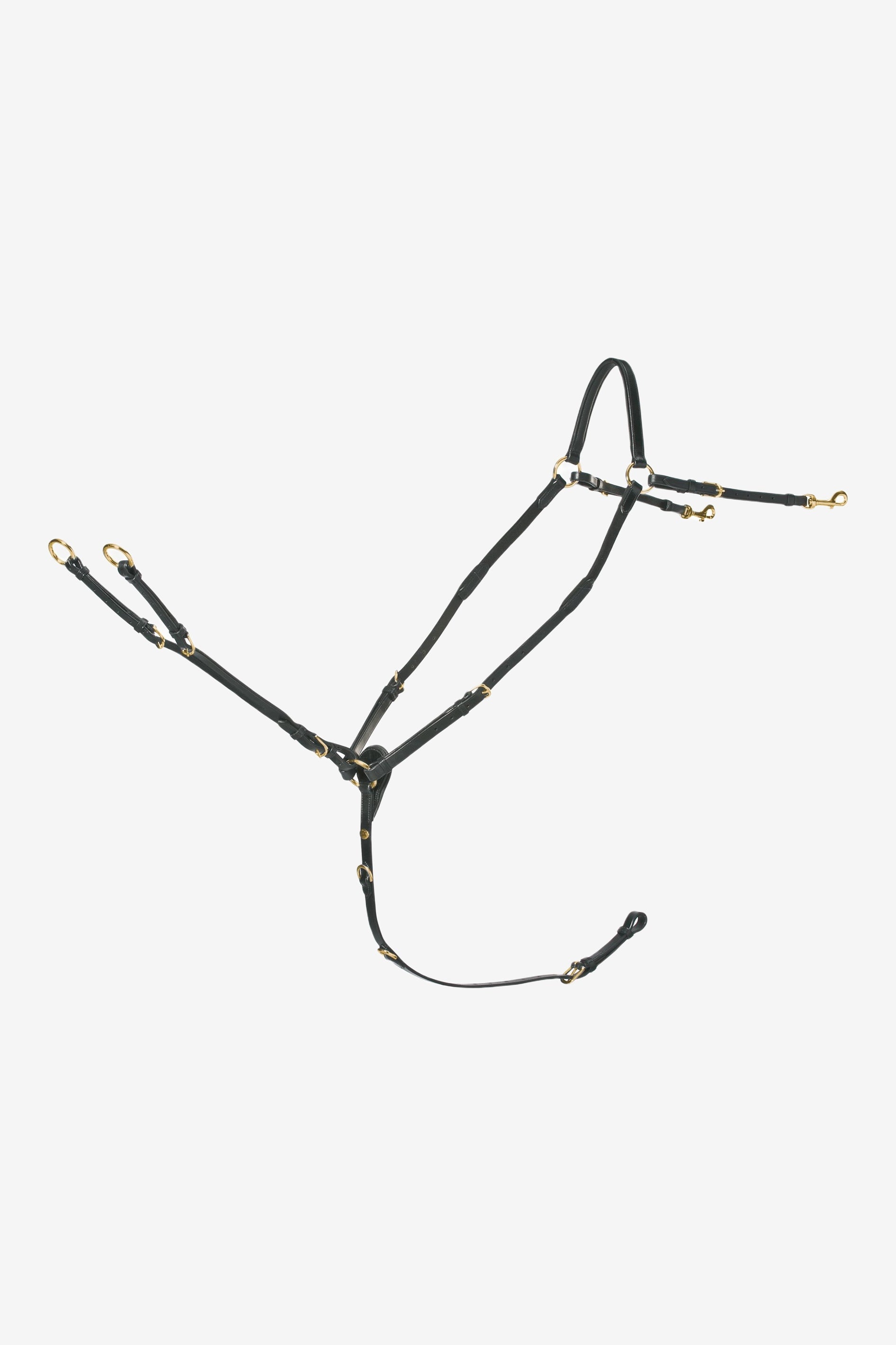Et elegant og smidigt fortøj af høj kvalitet læder. Aftagelig martingal med justerbar længde. Elastisk del ved skulderen, der gør fortøjet endnu mere fleksibelt.