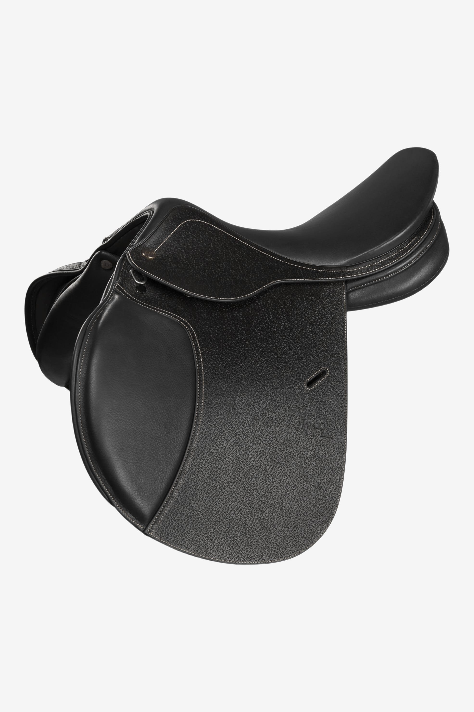 Hoppsadel med smal midja i sitsen. Ovandel, kåpor och bossor i europeiskt läder. Sadelgjordsstroppar i kraftigt österrikist läder. Övriga delar av sadeln är i Quick CleanTM, ett slags konstläder som är väldigt lättskött.
