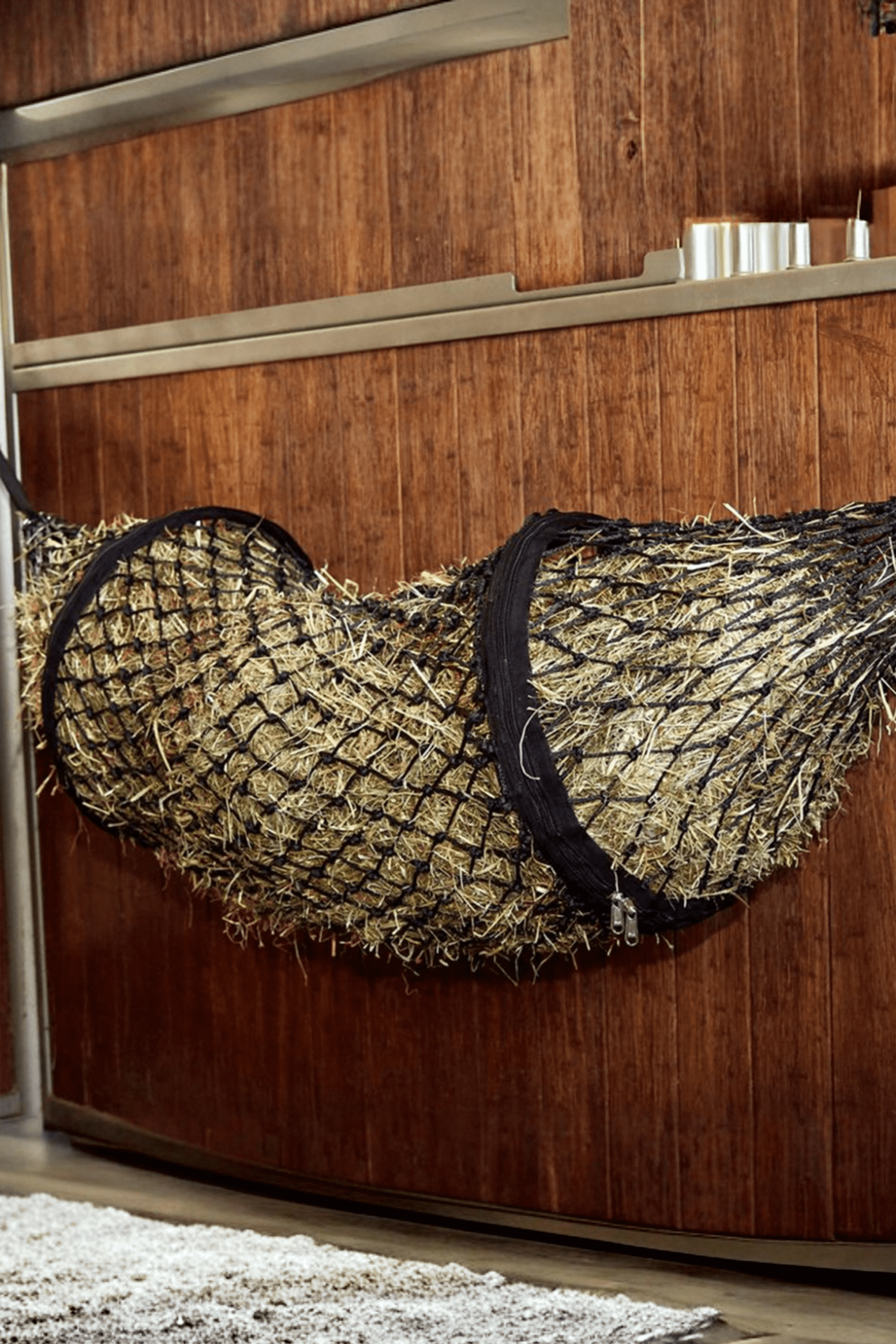 Ett smidigt hönät i form av en tunnel med en metallring som stabiliserar nätet i varje ände. Dessa ringar ser till att nätet håller formen samt gör det stabilt. Dragkedjor gör det enkelt att fylla nätet med hö. Enkelt att ta med sig på resande fot.