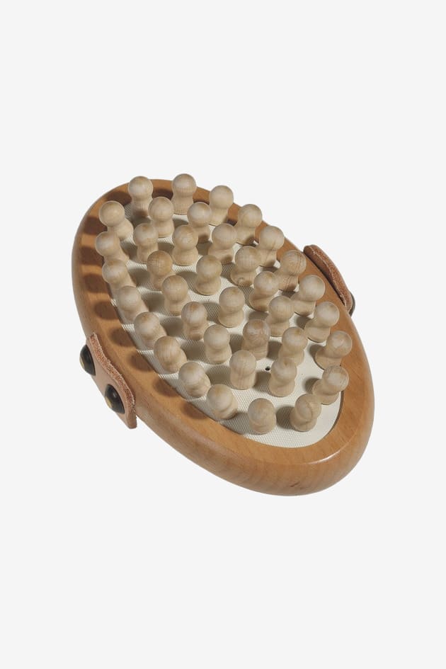 Liten och behändig massageborste med träknoppar. Läderrem på ovansidan gör borsten lättar att hålla medan du masserar din häst. Använd med fördel ihop med ett milt liniment för att få igång blodcirkulationen ordentligt.